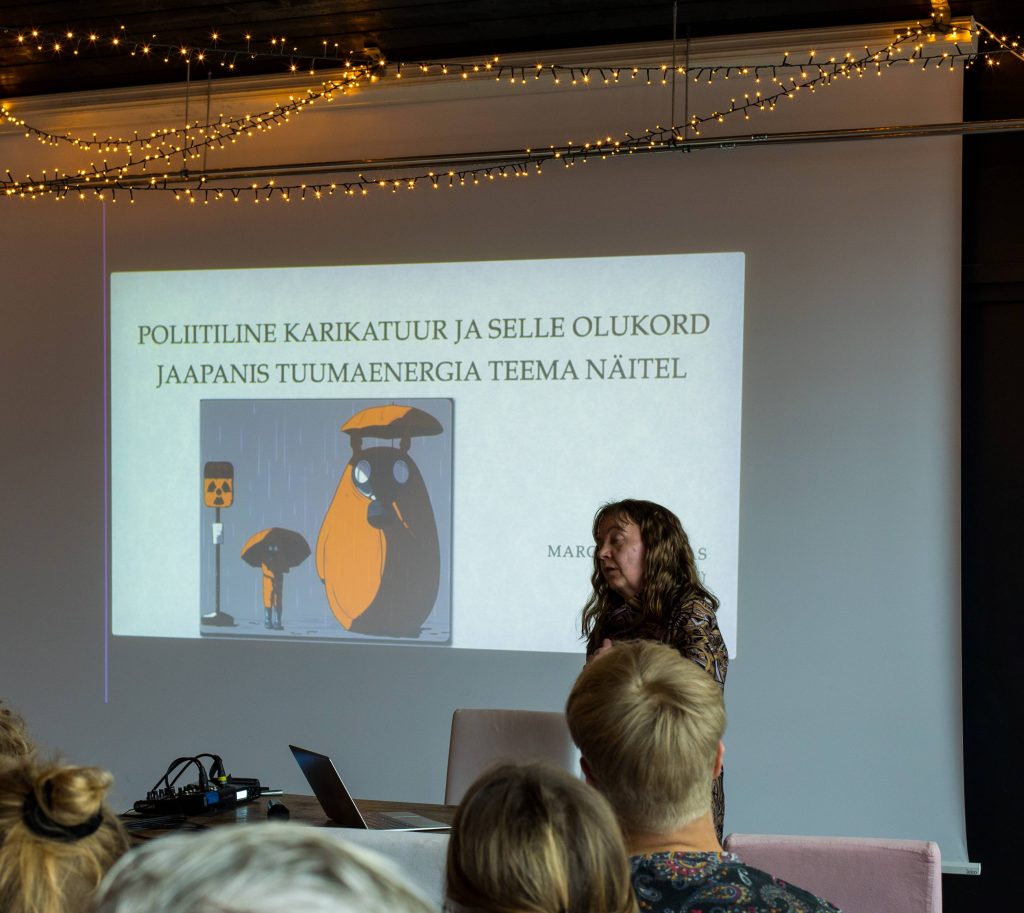 Japanoloog Margit Juurikas andis ülevaate jaapanlaste poliitilistest karikatuuridest ning sellest kuidas võib nalja uurimine aidata mõista erinevaid kultuure. Ta püüdis avada nalja tõsisemat külge, rääkides sellest kui ventiilist, mis aitab pingeid vähendada ning selgitas, kuidas naljad kultuure eristavad ja ühendavad.