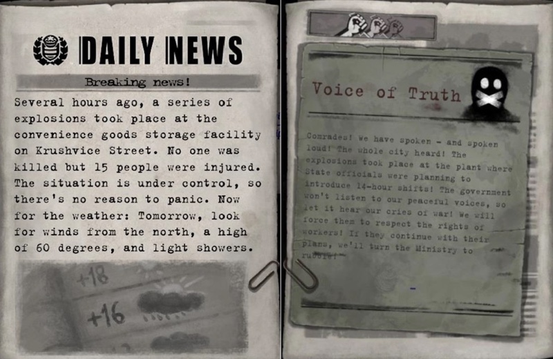 Thus, the most obvious distinction of Beholder’s semiotic space is that of the apartment versus the city. The phenomenon of fluid privacy highlighted earlier is reinforced by the constant arrival of external forces on the scene, such as anti- authoritarians acting behind the scenes, riots, and moving tenants. All these forces come from the periphery of the sub-semiosphere of the neighbourhood, merging into Kruchvice Street, the core of the action. Kruchvice is, in other words, a crossroads with fluid borders, defined by its lack of normality, but also by its constant dialectic with the wider Beholder society. A characteristic example of the dialectic with the external world and the coexistence of different voices can be found at the level of textuality in the news that regularly arrives in the mailbox. On the front page of the newspaper is the official state version of an event, while on the back page there is the anti-state counter- argument, an accusatory discourse (see Fig. 3). This fusion of different voices goes beyond the boundaries of playfulness and echoes the gloom that is fostered in the atmosphere of the game and the dominance of propaganda.