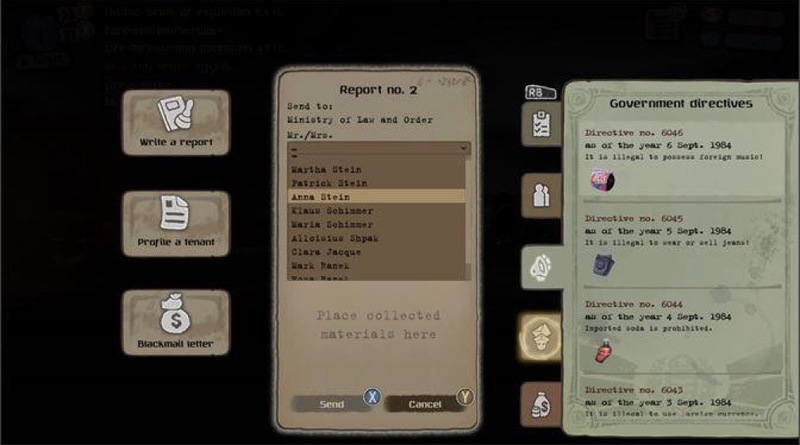 In addition to spying on tenants, players can also interact with objects to achieve the goals of the game. Objects are divided into two categories: a) those that provide useful information about the tenant’s profile, mainly related to a hobby, e.g., a cookbook, a tennis racket, etc. and b) illegal items[8]. The discovery of an illegal item can be used in two ways: a) to denounce the tenant to the state or b) to blackmail the tenant with a financial benefit for the main character. Money is a key element for the completion of missions and its acquisition becomes an end in itself for survival in the game. The preparation of each type of report is carried out by Carl in his office. By successfully completing a report on each tenant’s profile, the main character receives a minimal amount of money from the government as a reward.