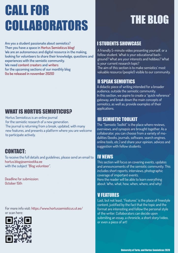 Are you a student passionate about semiotics? Then you have a space in Hortus Semioticus blog! We are an autonomous and digital resource in the making, looking for volunteers to share their knowledge, questions and experiences with the semiotic community. We need content creatorsand writersfor the upcoming sections of our monthly blog (to be released in November 2020):